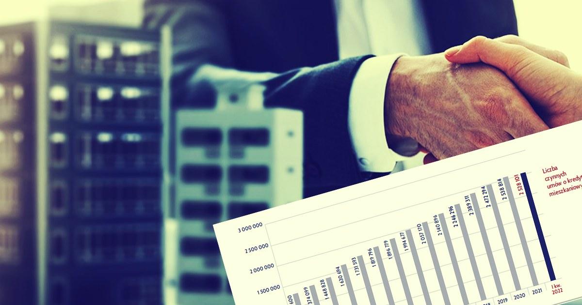 Liczba czynnych umów o hipotekę w I kw. wyniosła ponad 2,5 mln, to mniej o 0,8% w porównaniu do stanu z IV kwartału 2021 r. Spadła również liczba nowo udzielonych kredytów, konkretnie o 25,27%, z kolei wartość nowych kredytów obniżyła się o niecałe 25%.