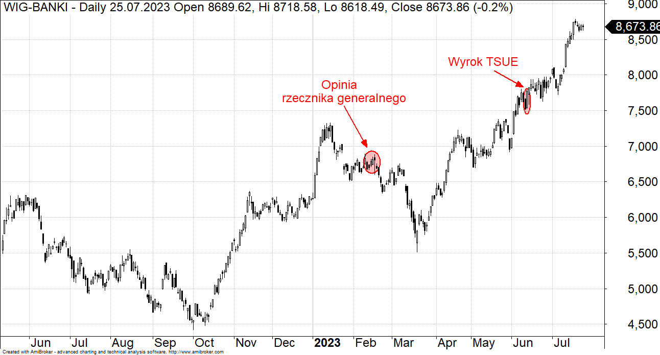Czerwcowy wyrok TSUE był wyczekiwany od dłuższego czasu przez rynek, dlatego nie wywołał gwałtownego spadku notowań indeksu WIG-Banki. Już lutowa opinia rzecznika generalnego TSUE zapowiadała, że wyrok zapadnie na korzyść kredytobiorców. Wtedy też zakładano, że może to być kolejny bodziec do złożenia pozwu sądowego przeciwko bankom, w szczególności, że ogólna liczba wyroków sądowych zapadających na korzyść kredytobiorców jest rekordowa.