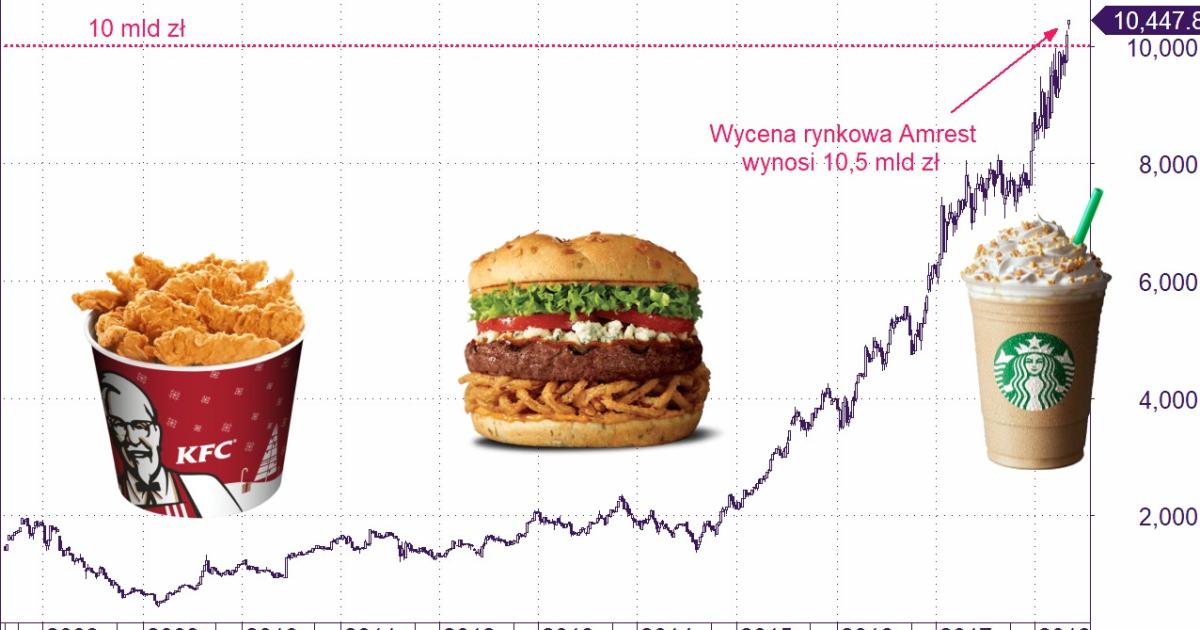 Kurs akcji AmRest Holdings SE pnie się w górę i właśnie wyszedł na historyczne maksima. Wycena spółki przekroczyła 10 mld zł. W portfolio spółki znajdują się takie marki jak: KFC, Pizza Hut, Burger King czy Starbucks. Jeszcze na początku 2015 roku cała firma była warta 2 mld zł, a dzisiaj jest wyceniana 4 razy więcej.