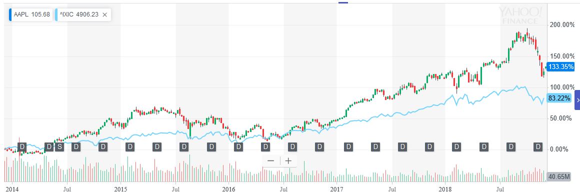 Notowania Apple (świecie) na tle Nasdaq Composite (linia)