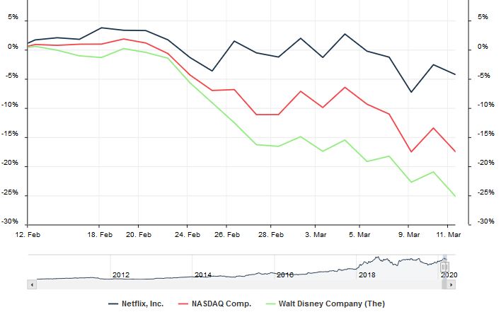 2. Notowania spółki Netflix na tle Nasdaq Composite i Walt Disney od 12 lutego