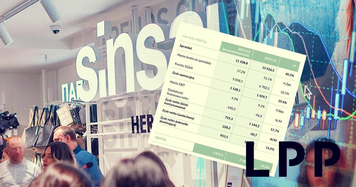 LPP, właściciel marek odzieżowych dostępnych w kraju i za granicą zaprezentował wyniki finansowe i podsumował rok obrotowy 2022/23. Skonsolidowany zysk netto wyniósł niecałe 1,1 mld zł, wobec 953 mln zł w 2021 r. Skonsolidowane przychody grupy wyniosły 15 926,5 mln zł, gdzie jeszcze w 2021 r. było to 11 338,79 mln zł. Spółka zapowiedziała również wypłatę jednej z najwyższych w historii dywidendy, co podniosło kurs akcji o 7%.