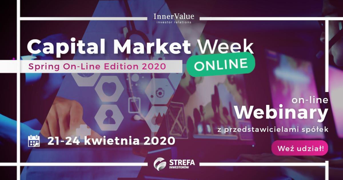 Capital Market Week Online to największe wydarzenie giełdowe tej wiosny, którego organizatorem jest Strefa Inwestorów wraz z agencją relacji inwestorskich Inner Value. Zapisy i wszelkie szczegóły na temat wydarzenia można znaleźć na dedykowanej do tego stronie internetowej. Formuła spotkania zakłada około 30 minutową prezentację spółki, a następnie 15 minutową sesję pytań i odpowiedzi.