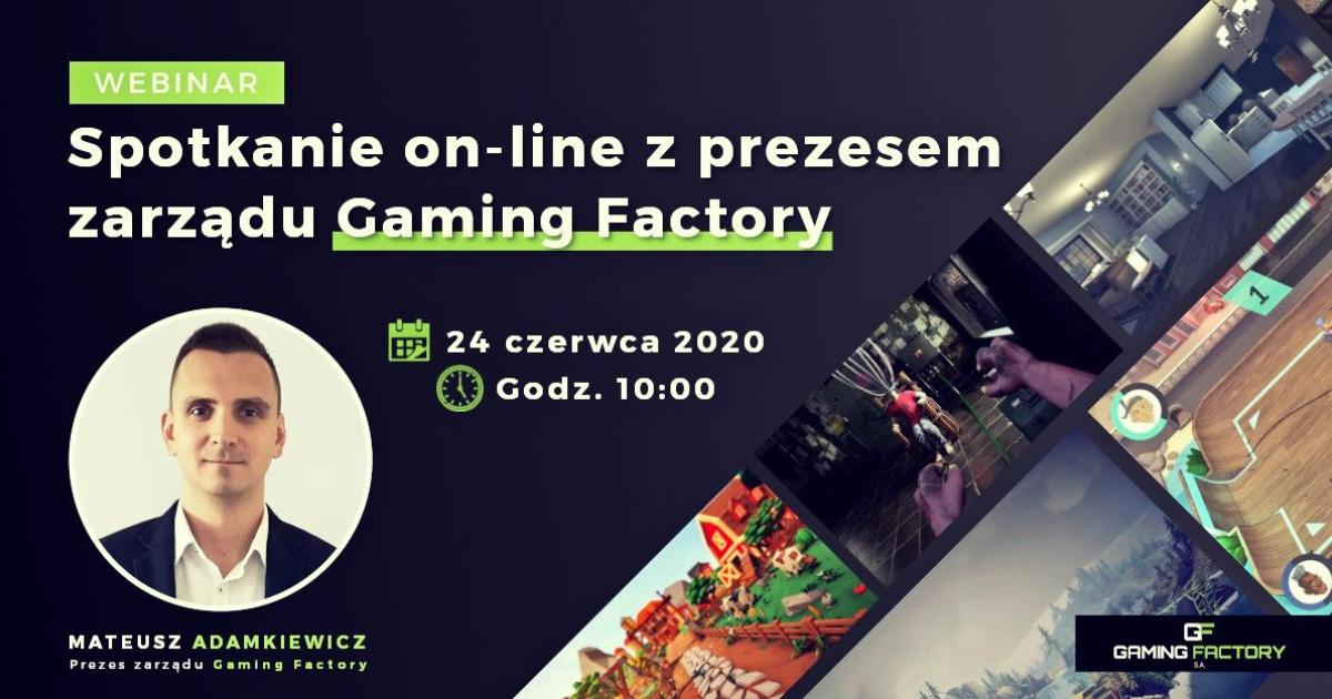 W środę, 24 czerwca 2020 roku o godz. 10.00 zapraszamy na konferencję online Gaming Factory. Spółkę będzie reprezentować prezes zarządu, Mateusz Adamkiewicz. Podczas spotkania porozmawiamy o planach debiutu na GPW oraz zaplanowanych premierach gier. Inwestorzy będą mogli zadawać pytania podczas konferencji.