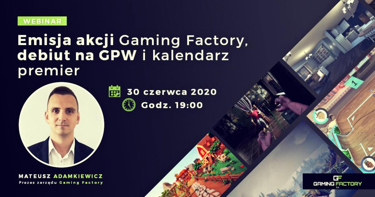 We wtorek, 30 czerwca 2020 roku o godz. 19.00, zapraszamy na webinar z prezesem zarządu Gaming Factory, Mateuszem Adamkiewiczem. Podczas spotkania porozmawiamy o trwającej emisji akcji, debiucie na GPW, zaplanowanych premierach oraz hossie na rynku gamingowym. W trakcie webinaru inwestorzy będą mogli zadawać pytania.