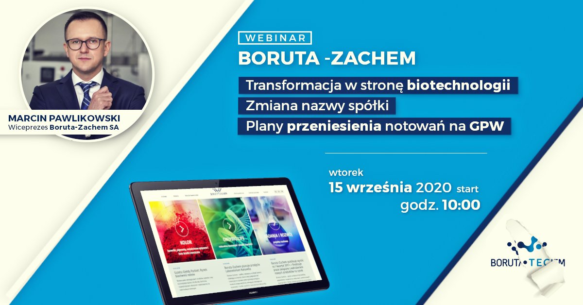 We wtorek, 15 września 2020 roku o godz. 10:00 zapraszamy na webinar z zarządem Boruty-Zachem – Marcinem Pawlikowskim, wiceprezesem zarządu oraz prof. Marcinem Łukaszewiczem, odpowiedzialnym w grupie za projekty biotechnologiczne. Podczas spotkania porozmawiamy o kierunkach rozwoju działalności, transformacji w stronę biotechnologii i planach przejścia na główny rynek GPW. Inwestorzy będą mogli zadawać pytania podczas webinaru.