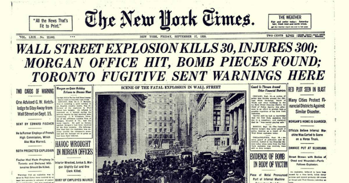 Dokładnie o godzinie 12:01 dnia 16 września 1920 roku na Wall Street wybuchła bomba. Zginęło blisko 40 osób, a 143 zostały poważnie ranne. Dziś mija 100 lat od tamtego tajemniczego wydarzenia.