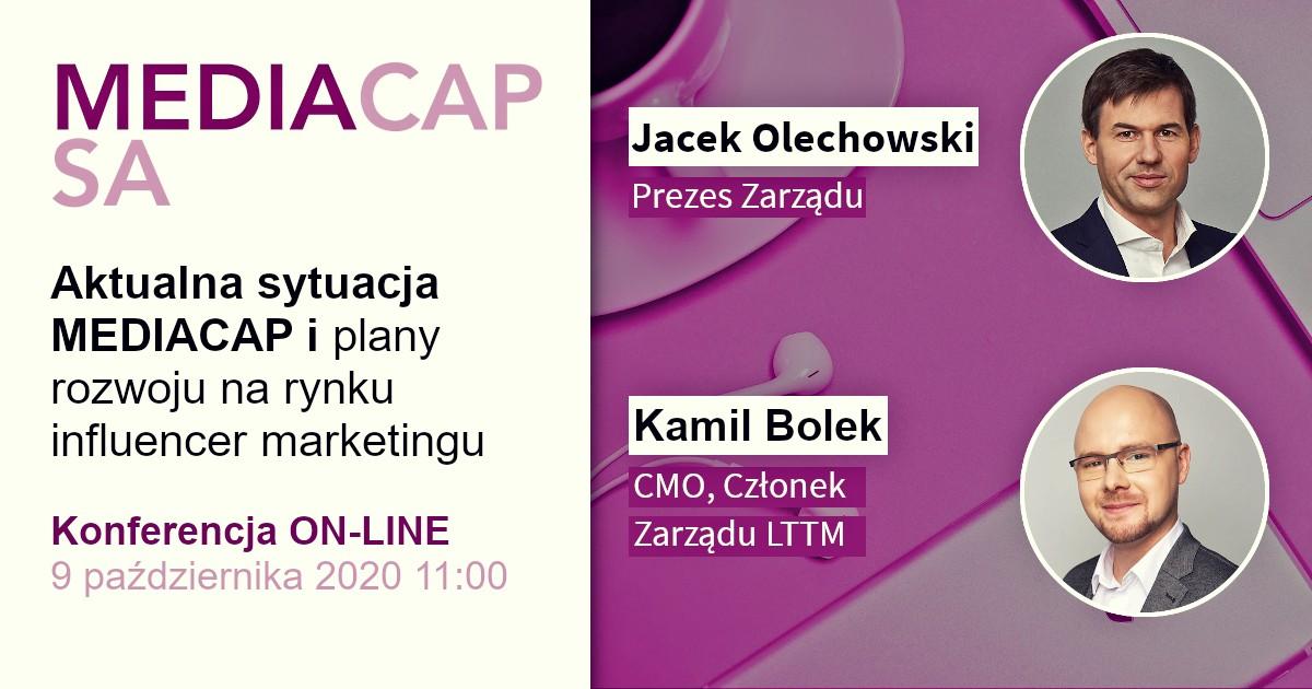 W piątek, 9 października 2020 roku o godz. 11:00 zapraszamy na webinar z prezesem zarządu MEDIACAP, Jackiem Olechowskim oraz członkiem zarządu LTTM, Kamilem Bolkiem. Podczas spotkania porozmawiamy o bieżącej działalności spółki ze szczególnym uwzględnieniem influencer marketingu. Inwestorzy będą mogli zadawać pytania podczas webinaru.