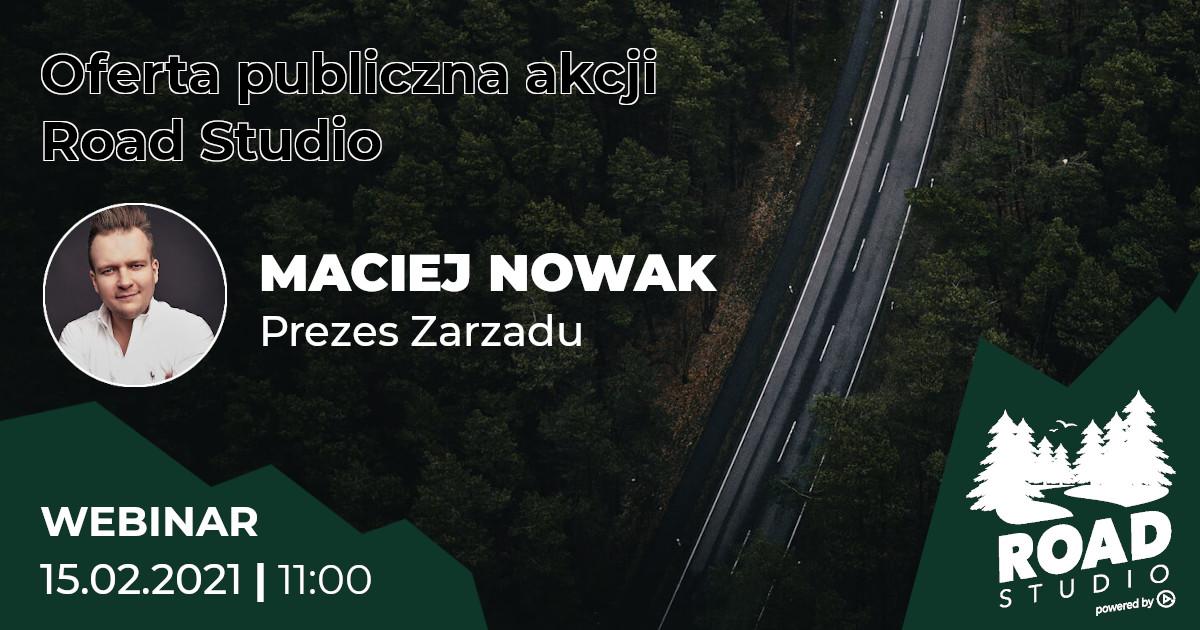 W poniedziałek, 15 lutego 2021 roku o godz. 11:00 zapraszamy na webinar z prezesem zarządu Road Studio, Maciejem Nowakiem. Podczas spotkania zostaną omówione szczegóły publicznej oferty akcji. Inwestorzy będą mogli zadawać pytania podczas webinaru.