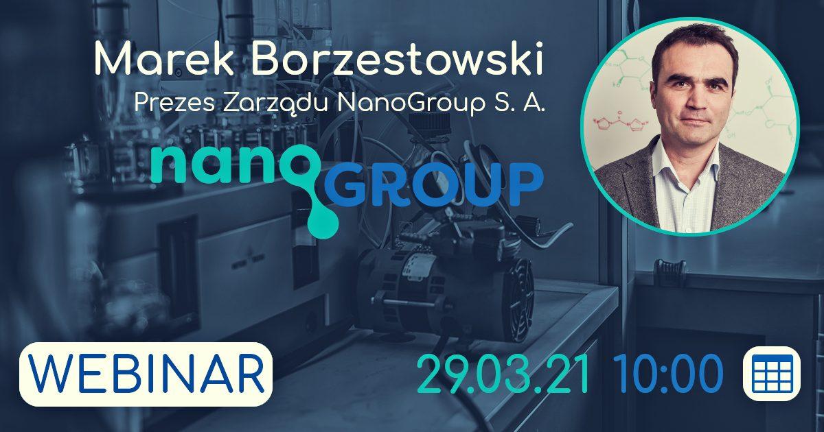 W poniedziałek, 29 marca 2021 roku o godz. 10:00 zapraszamy na webinar z prezesem zarządu NanoGroup, Markiem Borzestowskim. Podczas spotkania prezes spółki przedstawi aktualny stan prac badawczo-rozwojowych, realizację strategii w warunkach COVID-19 oraz nowe kierunki rozwoju. Inwestorzy będą mogli zadawać pytania podczas webinaru.