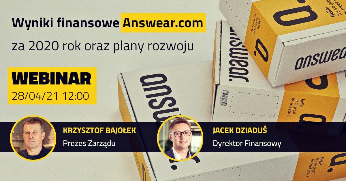 W środę, 28 kwietnia 2021 roku o godz. 12:00 zapraszamy na webinar z prezesem zarządu Answear.com, Krzysztofem Bajołkiem oraz dyrektorem finansowym Answear.com Jackiem Dziadusiem. Podczas spotkania zostaną omówione wyniki finansowe spółki za 2020 rok oraz plany rozwoju. Inwestorzy będą mogli zadawać pytania podczas webinaru.