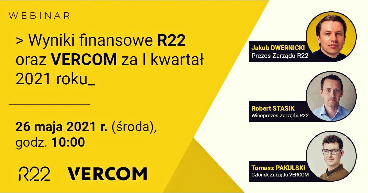 Obydwie spółki zaprezentują wyniki finansowe za I kwartał 2021 roku. W środę, 26 maja 2021 roku o godz. 10:00 zapraszamy na webinar z prezesem zarządu Grupy R22, Jakubem Dwernickim; wiceprezesem zarządu, Robertem Stasikiem oraz członkiem zarządu Vercom, Tomaszem Pakulskim. Inwestorzy będą mogli zadawać pytania podczas webinaru.