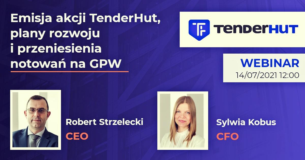 W środę 14 lipca 2021 roku o godz. 12:00 zapraszamy na webinar z zarządem TenderHut – Robertem Strzeleckim, CEO oraz Sylwią Kobus, CFO. Podczas spotkania zostaną omówione szczegóły emisji akcji, kierunki rozwoju spółki oraz plany przeniesienia notowań na Główny Rynek GPW. Uczestnicy będą mogli zadawać pytania podczas webinaru.