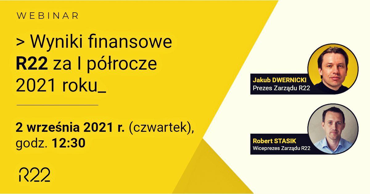 W czwartek, 2 września 2021 roku o godz. 12:30 zapraszamy na webinar z prezesem zarządu Grupy R22, Jakubem Dwernickiem oraz wiceprezesem zarządu, Robertem Stasikiem. Podczas spotkania porozmawiamy o wynikach finansowych spółki za I półrocze 2021 roku i perspektywach rozwoju Grupy R22. Inwestorzy będą mogli zadawać pytania podczas webinaru.