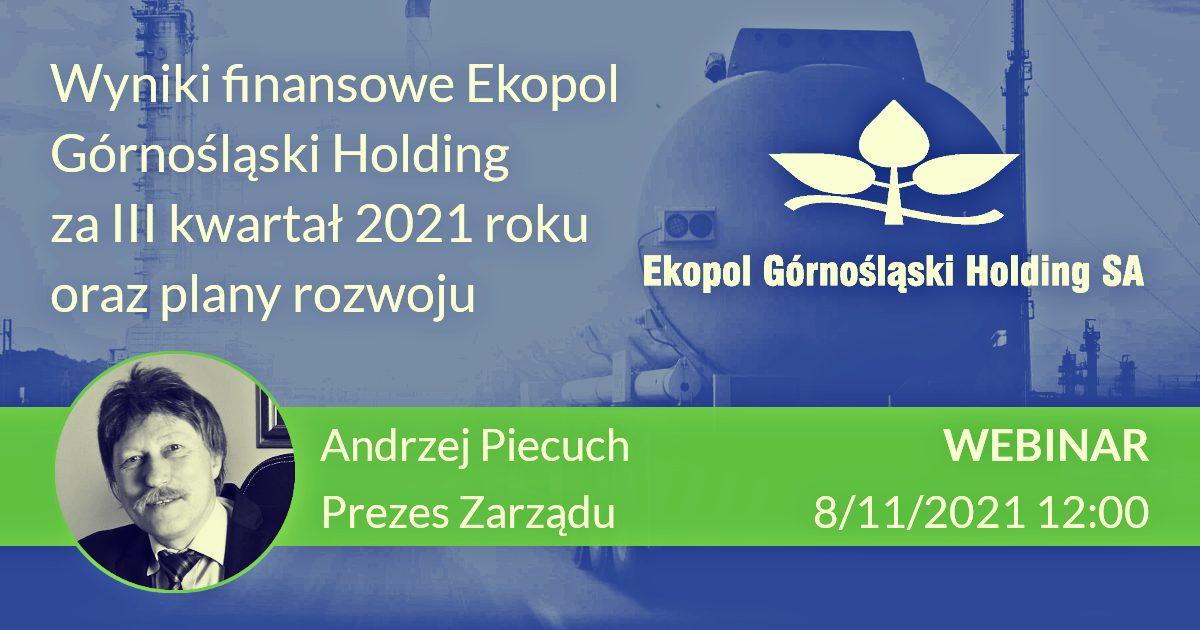 W poniedziałek, 8 listopada 2021 roku o godz. 12:00 zapraszamy na webinar z prezesem zarządu Ekopol Górnośląski Holding, Andrzejem Piecuchem. Podczas spotkania zostaną omówione wyniki finansowe spółki za III kwartał 2021 roku oraz dalsze plany rozwoju. Inwestorzy będą mogli zadawać pytania podczas webinaru.