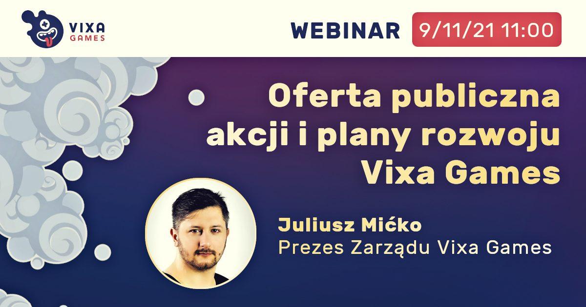 We wtorek, 9 listopada 2021 roku o godz. 11:00 zapraszamy na webinar z prezesem zarządu Vixa Games, Juliuszem Mićko. Podczas spotkania zostaną omówione plany rozwoju na rynku gier oraz szczegóły planowanej emisji akcji. Inwestorzy będą mogli zadawać pytania podczas webinaru.