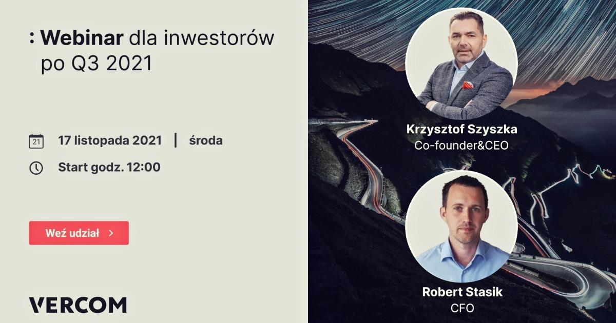 O wynikach finansowych Vercom za III kwartał 2021 roku oraz planach rozwoju będzie można wysłuchać podczas webinaru z zarządem spółki – prezesem Krzysztofem Szyszką oraz dyrektorem finansowym, Robertem Stasikiem. Spotkanie odbędzie się w środę, 17 listopada 2021 roku o godz. 12:00. Inwestorzy będą mogli zadawać pytania podczas webinaru.