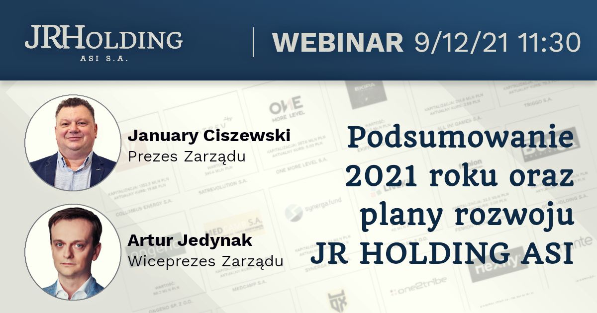 W czwartek, 9 grudnia 2021 roku o godz. 11:30 zapraszamy na webinar z zarządem JR HOLDING ASI – Januarym Ciszewskim, prezesem zarządu oraz Arturem Jedynakiem, wiceprezesem zarządu. Podczas spotkania Zarząd JRH odpowie na pytania dotyczące działalności w 2021 roku, ostatnich inwestycji oraz planów rozwoju. Inwestorzy podczas webinaru będą mogli zadawać pytania online.