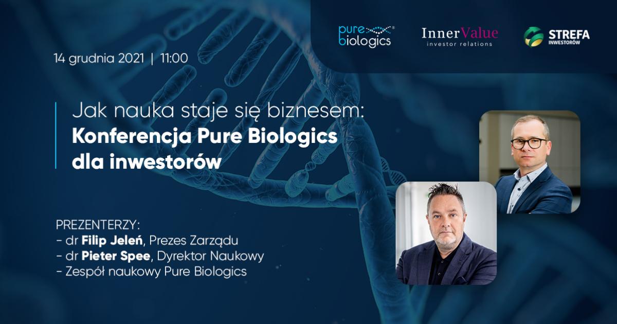 We wtorek, 14 grudnia 2021 r. o godz. 11:00 zapraszamy na konferencję online z przedstawicielami spółki Pure Biologics. Podczas spotkania przeznaczonego dla inwestorów omówione zostaną innowacje w spółce, poszczególne projekty aptamerowe, kluczowe kamienie milowe oraz transakcje rynkowe. Spotkanie przewidziane jest do godz. 13:30, a na koniec planowana jest sesja Q&A.