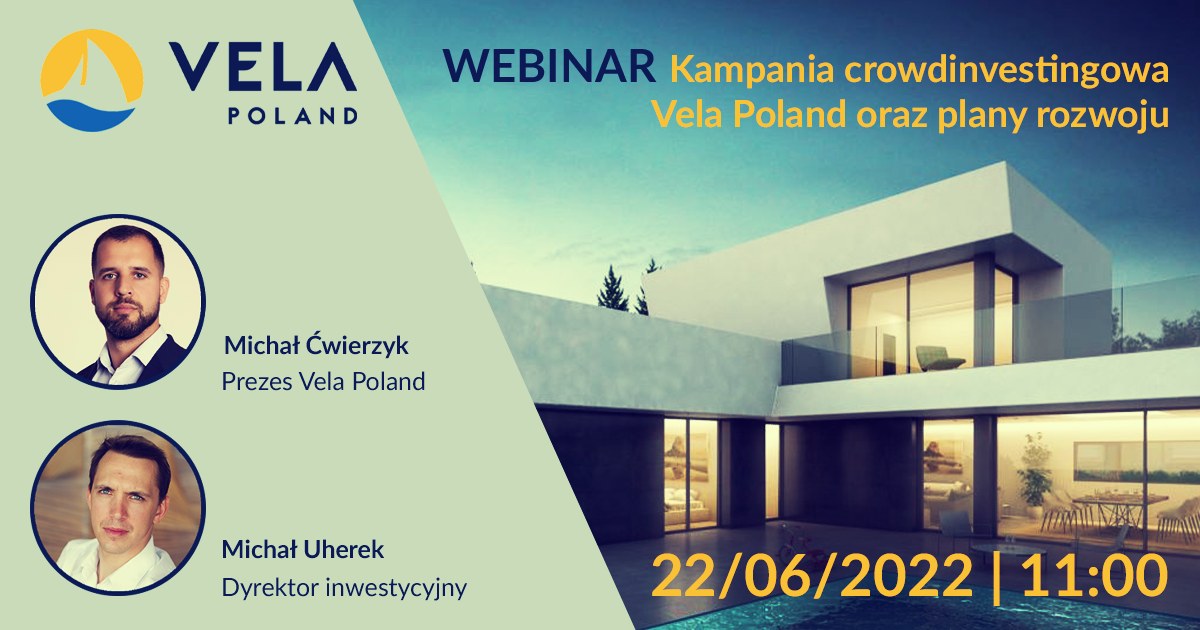W środę, 22 czerwca 2022 roku o godz. 11:00 zapraszamy na webinar z prezesem zarządu Vela Poland, Michałem Ćwierzykiem oraz dyrektorem inwestycyjnym, Michałem Uherkiem. Podczas spotkania zostaną omówione szczegóły kampanii crowdinvestingowej oraz plany rozwoju. Inwestorzy będą mogli zadawać pytania podczas webinaru.