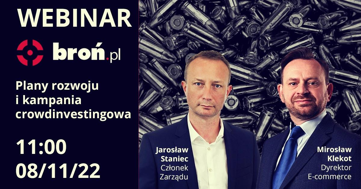 We wtorek, 8 listopada 2022 roku o godz. 11:00 zapraszamy na webinar z członkiem zarządu Broń.pl, Jarosławem Stańcem oraz dyrektorem e-commerce, Mirosławem Klekotem. Podczas spotkania zostaną omówione plany rozwoju spółki oraz szczegóły kampanii crowdinvestingowej. Inwestorzy będą mieli możliwość zadawania pytań podczas webinaru.