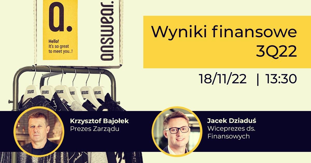 W piątek, 18 listopada 2022 roku o godz. 13:30 zapraszamy na webinar z prezesem zarządu Answear.com, Krzysztofem Bajołkiem oraz wiceprezesem zarządu ds. finansowych, Jackiem Dziadusiem. Podczas spotkania zostaną omówione wyniki finansowe spółki za III kwartał 2022 roku oraz dalsze plany rozwoju. Inwestorzy będą mogli zadawać pytania podczas webinaru.