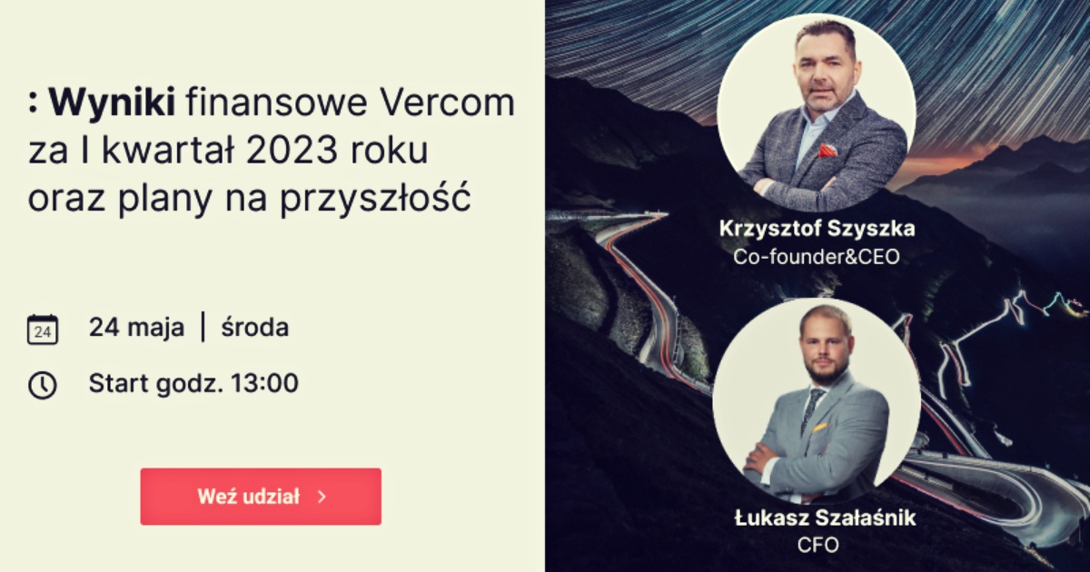 O wynikach finansowych Vercom za I kwartał 2023 roku będzie można posłuchać podczas webinaru z przedstawicielami spółki – prezesem Krzysztofem Szyszką oraz dyrektorem finansowym Łukaszem Szałaśnikiem. Spotkanie odbędzie się w środę, 24 maja 2023 roku o godz. 13:00. Inwestorzy będą mogli zadawać pytania podczas webinaru.