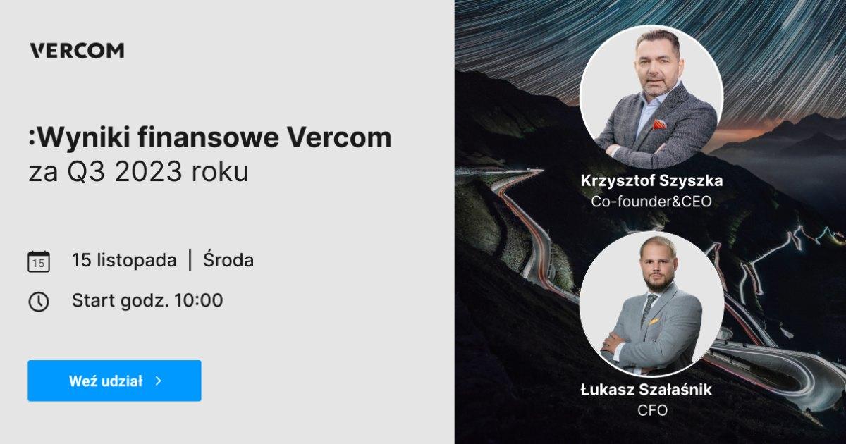O wynikach finansowych Vercom za III kwartał 2023 roku będzie można posłuchać podczas webinaru z przedstawicielami spółki – prezesem Krzysztofem Szyszką oraz dyrektorem finansowym Łukaszem Szałaśnikiem. Spotkanie odbędzie się w środę, 15 listopada 2023 roku o godz. 10:00. Inwestorzy będą mogli zadawać pytania podczas webinaru.