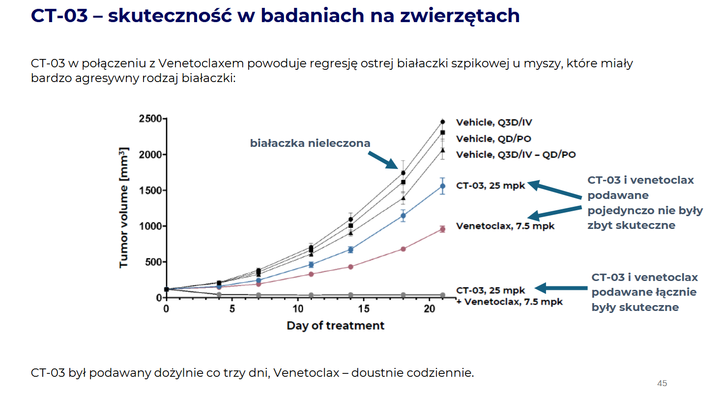 Warto przypomnieć, że RVU120 – flagowy projekt Ryvu Therapeutics - to potencjalny lek, który różni się od CT-03 etapem rozwoju oraz mechanizmem działania (blokuje białka CDK8/19). Jest on już testowany na pacjentach i znajduje się w drugiej fazie badań klinicznych. W przypadku wskazania związanego z ostrą białaczką szpikową badanie jako pojedyncza cząsteczka zostało wstrzymane, ale wciąż prowadzone są badania w skojarzeniu z Venetoclaksem. Tymczasem CT-03 przeszedł testy na zwierzętach, a badania na ludziach mogą rozpocząć się w ciągu kilkunastu miesięcy. Oba leki działają na inne białka, ale ich wspólnym celem jest leczenie trudnych nowotworów, w tym ostrej białaczki szpikowej.