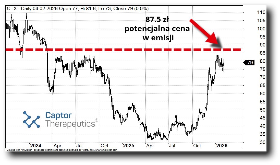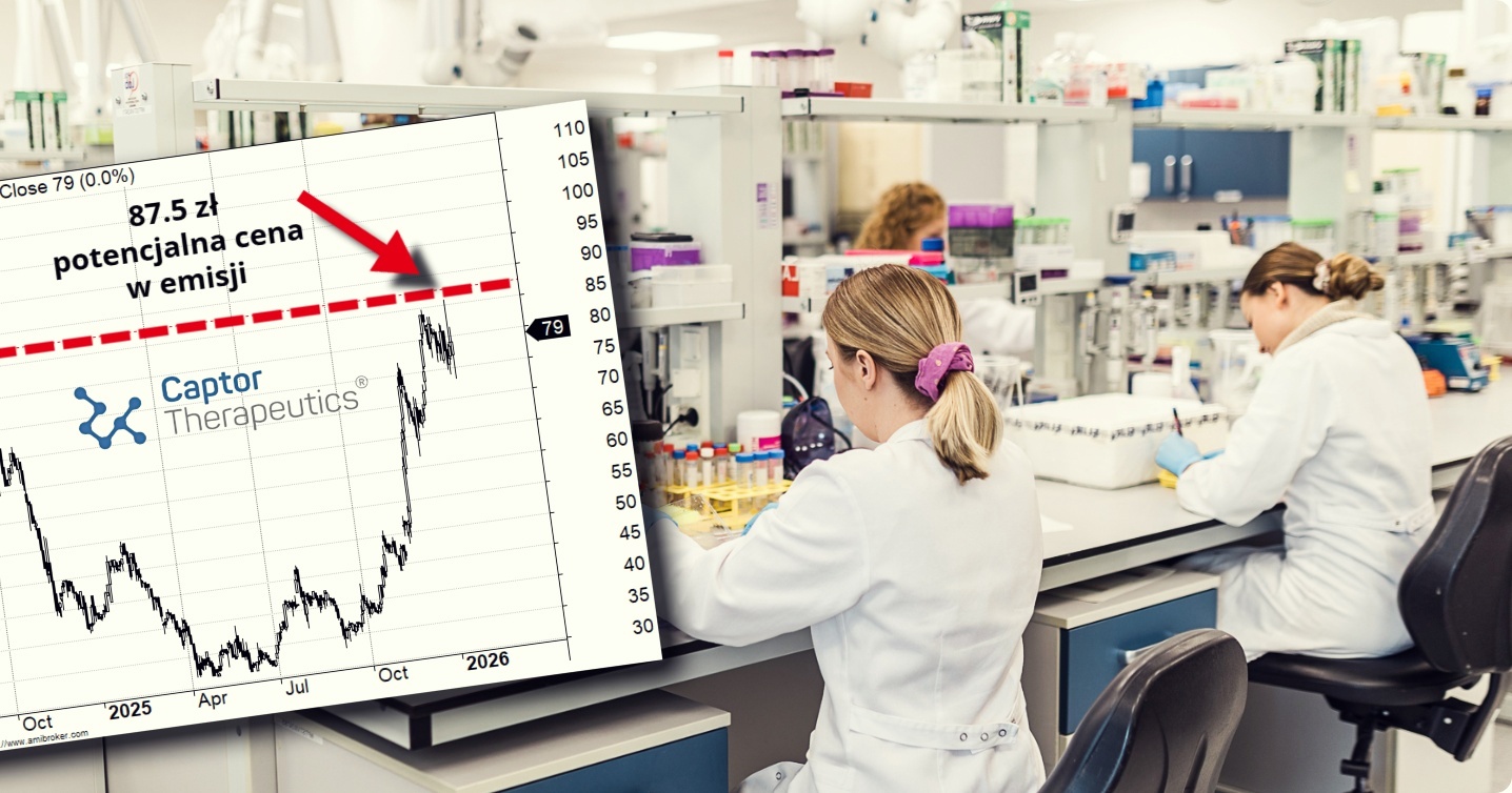 Captor Therapeutics wchodzi w kluczowy etap rozwoju i potrzebuje wzmocnić się kapitałowo poprzez emisję do 800 000 nowych akcji, co stanowi około 14,5% obecnego kapitału zakładowego. W ramach oferty spółka planuje pozyskać 70 mln zł, co oznacza cenę emisyjną akcji na poziomie 87,5 zł (powyżej rynku).