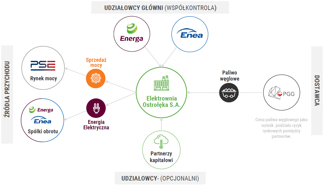 Budowa i eksploatacja nowego bloku w Ostrołęce C nie obejdzie się bez strategicznej współpracy z Eneą. Pozwoli to spółce Energa utrzymać w ryzach założenia strategii i podzieli ryzyka między partnerów. Spółka chce też pozyskać inwestora lub inwestorów finansowych do projektu, kiedy już parametry inwestycji zostaną szczegółowo określone i uzyska ona wsparcie z rynku mocy. Ten krok także ma zmniejszyć ryzyko inwestycji. Realizacja planów strategicznych zostanie też dodatkowo wsparta przez umowę z PGG na długoterminowe dostawy węgla dla Ostrołęki C (2 mln ton rocznie). Pozwoli to na optymalizację kosztów eksploatacyjnych (Ilustracja 2). Jeszcze w 2016 roku spółka planuje ogłosić przetarg na generalnego wykonawcę nowego bloku energetycznego w Ostrołęce, co wynika z założonego harmonogramu działań.