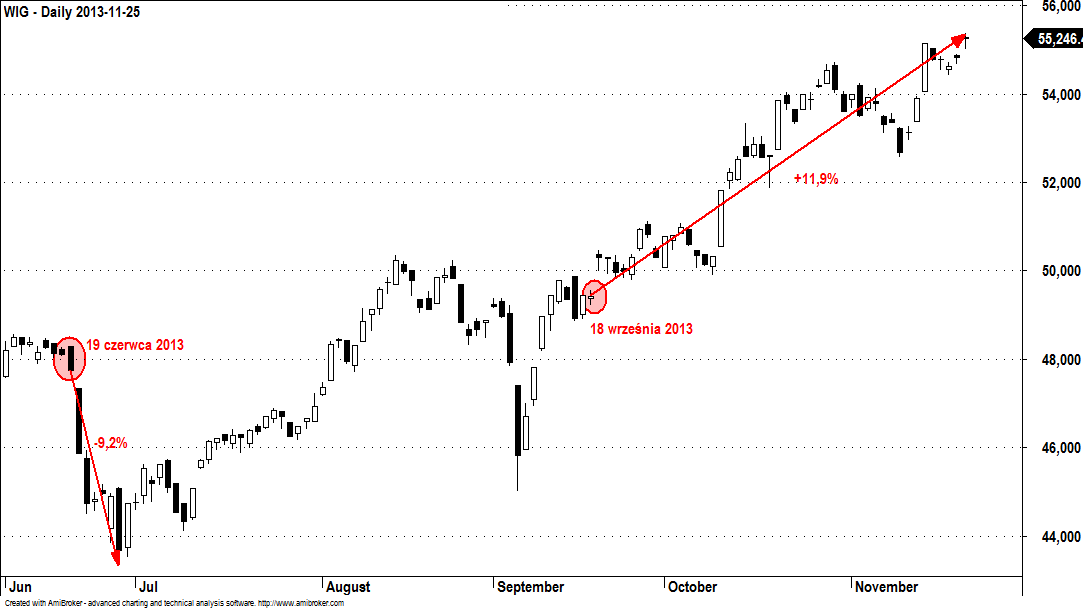 Kiedy jednak okazało się, że FED znowu zaskoczył i nie ograniczył programu QE3 (informując o tym 18 września 2013) indeks WIG ponownie kolejną sesję otworzył luką hossy. Potem na rynku widzieliśmy już tylko wzrosty. W zaledwie dwa miesiące indeks najszerszy GPW zyskał na wartości 11,9%.