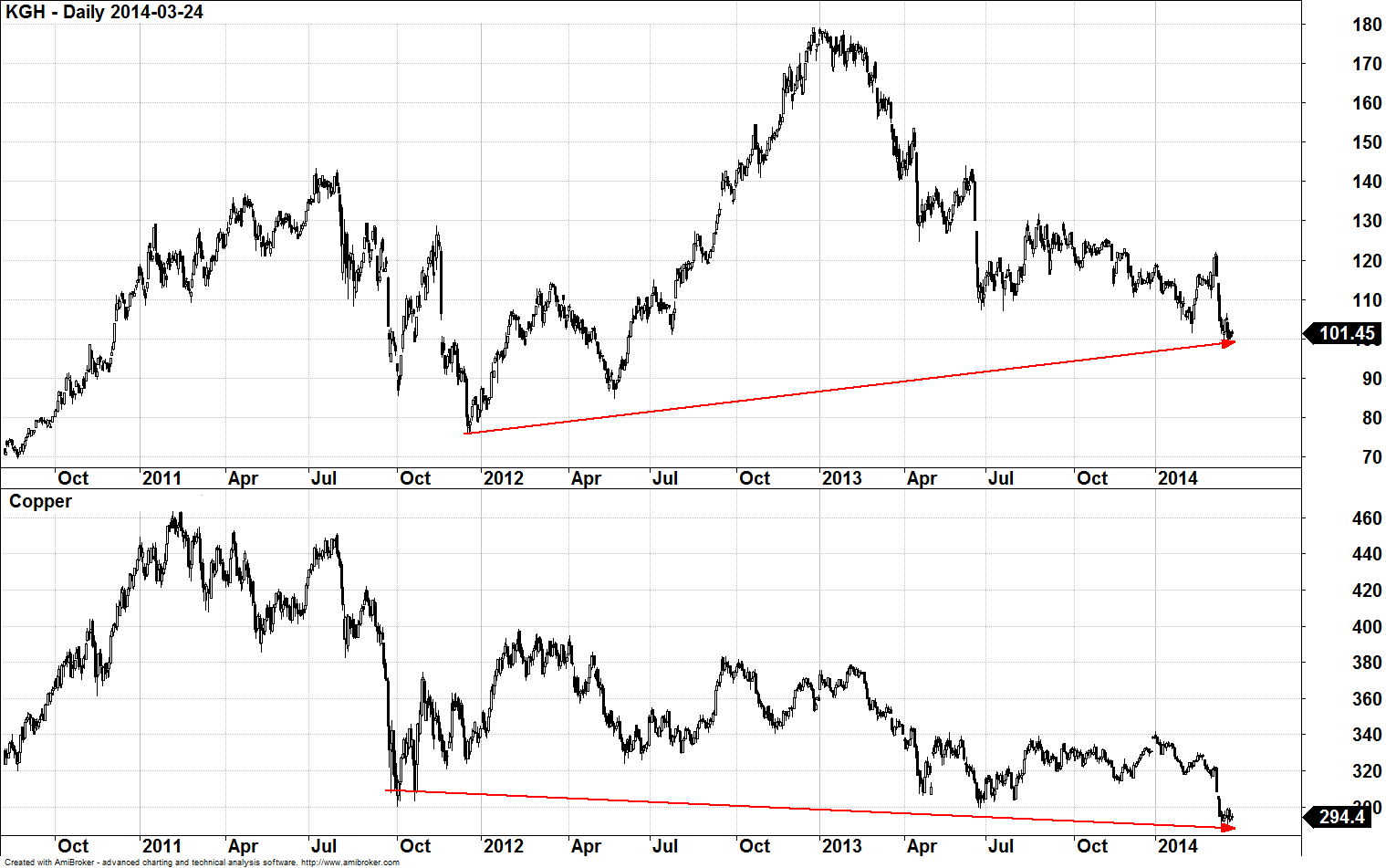 Wykres 1: KGHM (góra), Miedź (dół), lata 2011 - 2014.