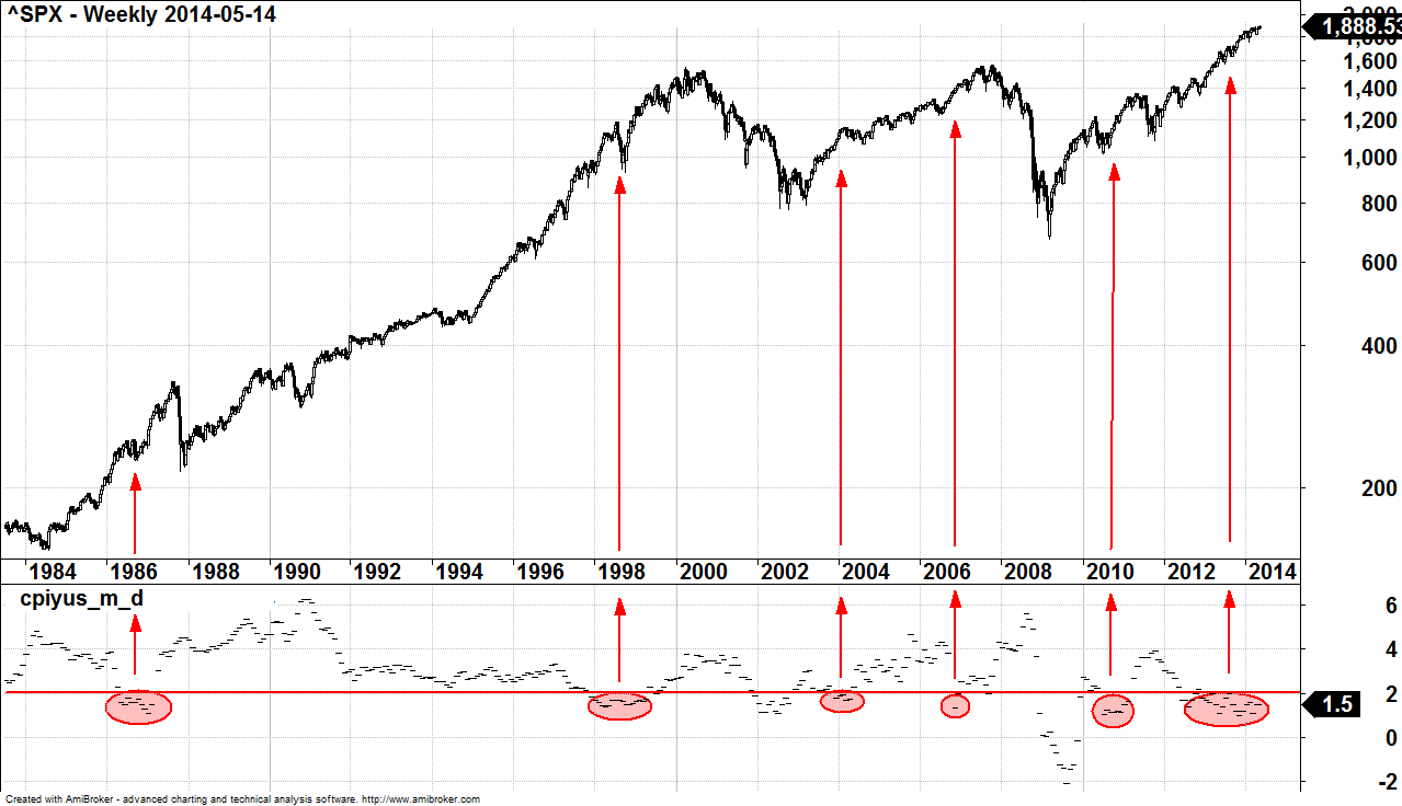 Wykres 2: Indeks S&P500 (góra), inflacja CPI R/R w USA (dół), lata 1984 - 2014, interwał tygodniowy.