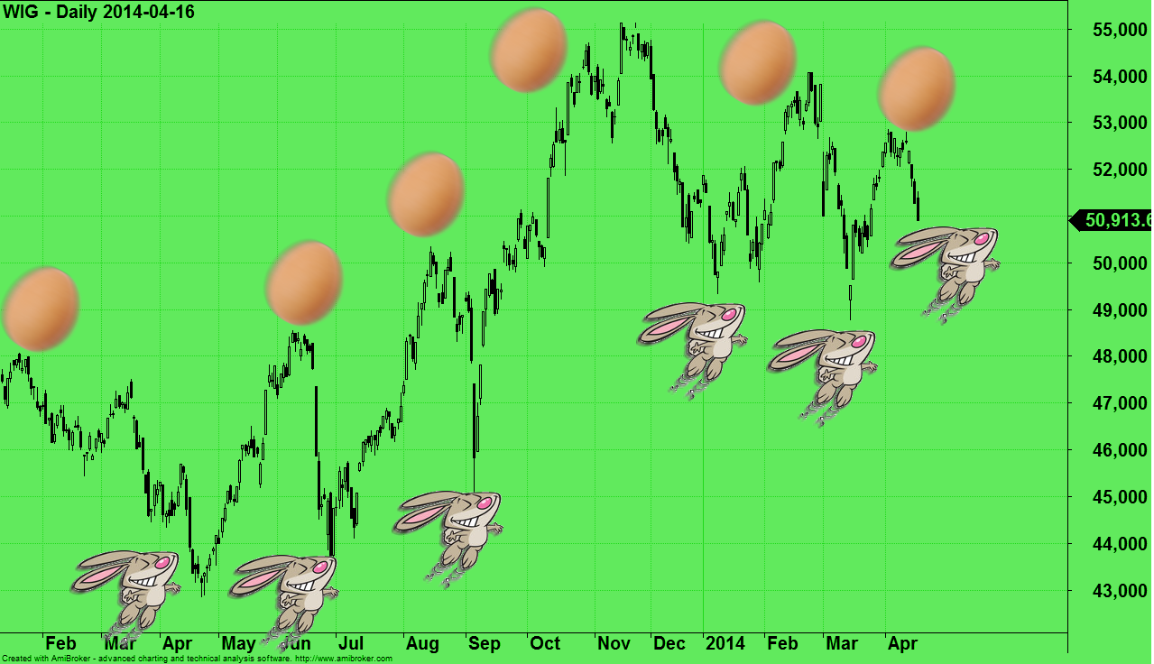 Jak nietrudno zauważyć na Wykresie 1, wszystkie kluczowe punkty zwrotne wyznaczane były w momencie pojawienia się jednej z dwóch formacji. Dynamiczne ruchy wzrostowe zawsze poprzedzone były tzw. formacją Skaczącego Zająca* (znanej także jako LBF, ang. Leaping Bunny Formation). Kluczowe szczyty ustanawiane były natomiast zawsze w momencie pojawienia się na wykresie formacji Spadającego Jajka** (zwanej także DEEF, ang. Declining Easter Egg Formation). Z dokładnej analizy wykresu wynika, że i w obecnej sytuacji historia powinna się powtórzyć. A więc z okazji zbliżających się Świąt Wielkanocnych życzmy sobie, aby koniec spadków był już bliski!