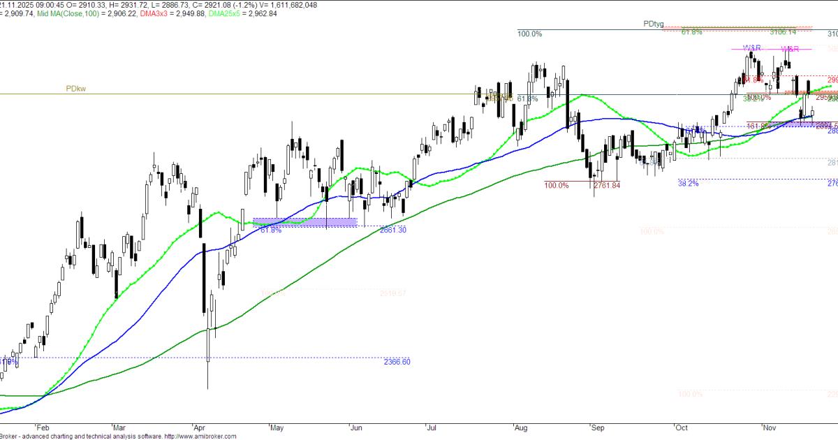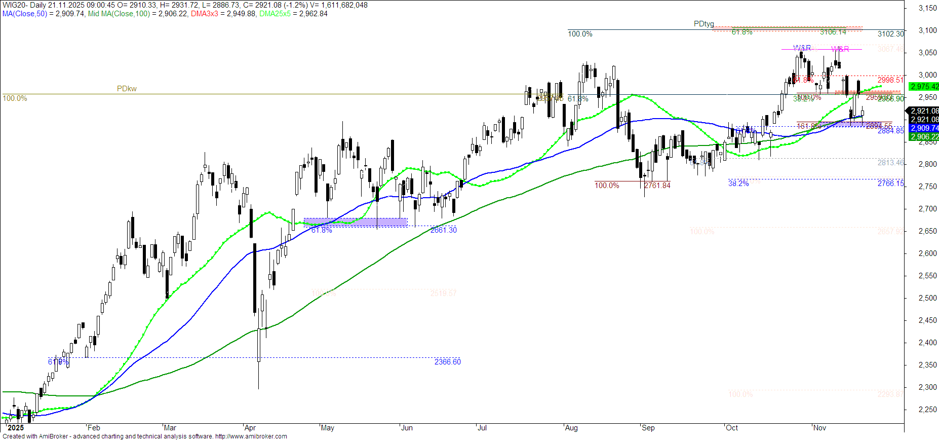 W poszukiwaniu sygnałów - 22 listopada 2025 - Dalsza wyprzedaż na GPW z testem wsparcia dziennego na dużych indeksach.