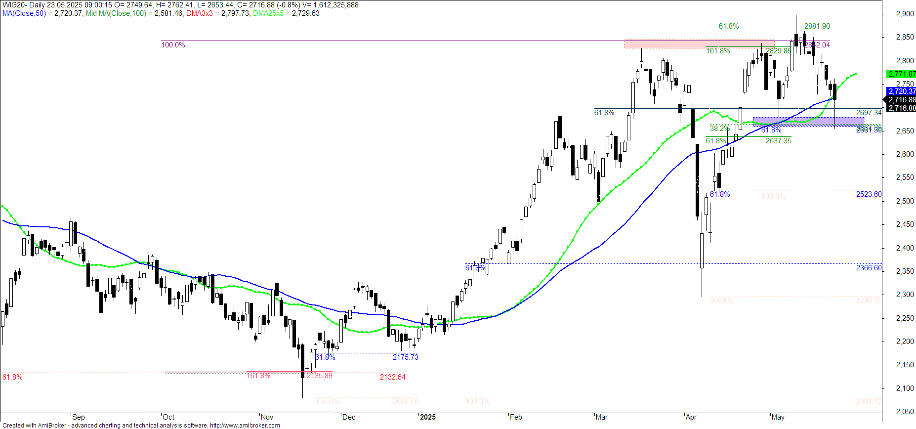 W poszukiwaniu sygnałów - 24 maja 2025 - Indeksy testują wsparcia dzienne i walczą o utrzymanie się w tygodniowym trendzie wzrostowym.