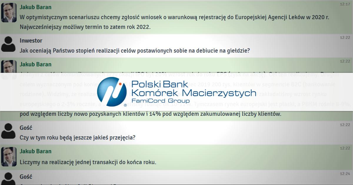 W poniedziałek, 18 września 2017 r. zorganizowaliśmy czat inwestorski z Prezesem PBKM, Jakubem Baranem. W czasie dyskusji prezes odpowiadał na pytania dotyczące wyników finansowych PBKM z I półrocze 2017 r., kontynuacji polityki dywidendowej oraz perspektyw rozwoju, m.in. dofinansowania z NCBIR w zakresie prób klinicznych w leczeniu ALS (stwardnienie zanikowe boczne). W spotkaniu, które cieszyło się dużym zainteresowaniem, wzięło udział ponad 250 inwestorów, a przedstawiciel spółki odpowiedział na 30 pytań. Zapraszamy do lektury całego zapisu czatu.