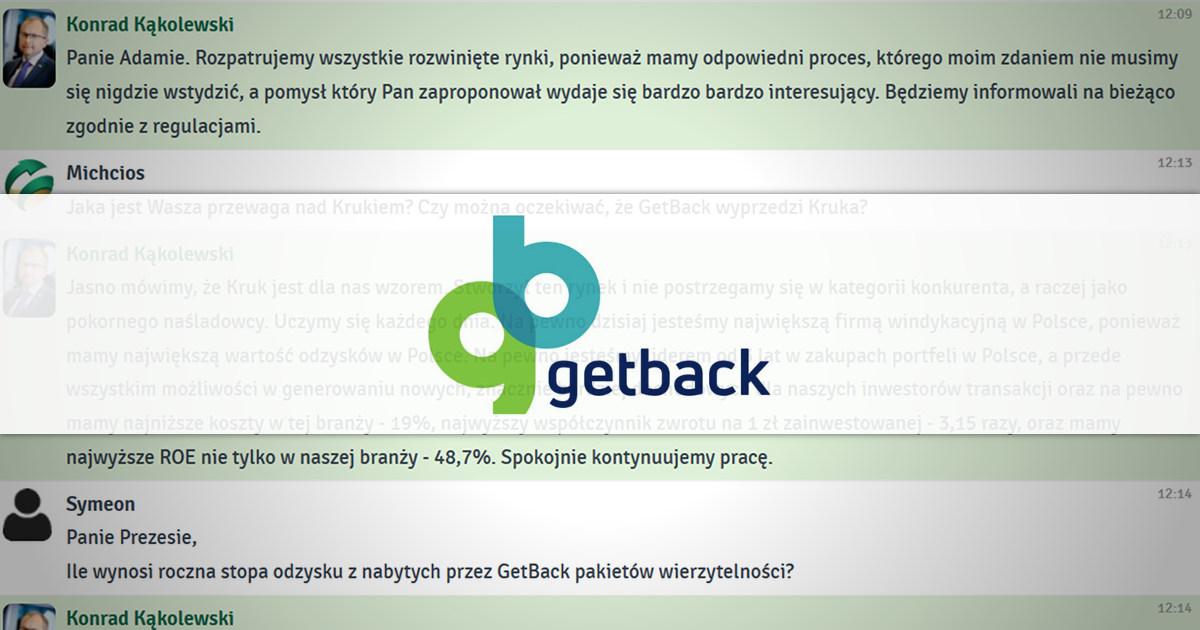 W środę, 27 września 2017 r. zorganizowaliśmy czat inwestorski z Prezesem GetBack, Konradem Kąkolewskim. W czasie dyskusji Prezes odpowiadał na pytania dotyczące wyników finansowych spółki po I półroczu 2017 r., prowadzenia w przyszłości polityki dywidendowej, perspektyw rozwoju spółki, szczególnie na rynkach zagranicznych, a także na temat rynku zarządzania wierzytelnościami. W spotkaniu, które cieszyło się dużym zainteresowaniem, wzięło udział blisko 700 inwestorów, a przedstawiciel spółki odpowiedział na 30 pytań. Zapraszamy do lektury całego zapisu czatu.
