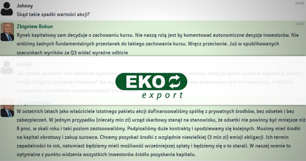 W piątek, 27 października 2017 r. zorganizowaliśmy czat inwestorski z Dyrektorem ds. Rozwoju Eko Export, Zbigniewem Bokunem. W czasie dyskusji przedstawiciel spółki odpowiadał na pytania dotyczące wyników finansowych spółki, prowadzonych inwestycji w Kazachstanie, polityki dywidendowej oraz perspektyw rozwoju Eko Exportu. W spotkaniu, które cieszyło się ogromnym zainteresowaniem, wzięło udział ponad 1200 inwestorów, którzy zadali w sumie 320 pytań, a przedstawiciel spółki odpowiedział na 66 pytań. Zapraszamy do lektury całego zapisu czatu.