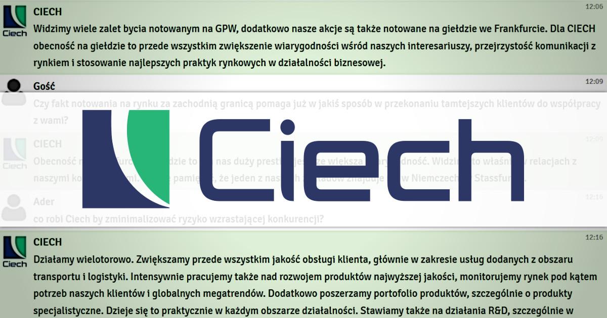 W środę, 28 marca 2018 r. zorganizowaliśmy czat inwestorski z przedstawicielem Grupy CIECH Mirosławem Wojtaszko, Dyrektorem Pionu Finansowo-Księgowego. W czasie dyskusji przedstawiciel spółki odpowiadał na pytania dotyczące wyników finansowych za 2017 r., polityki dywidendowej spółki, rosnącej konkurencji w branży oraz dalszych planów rozwoju Grupy CIECH. W spotkaniu wzięło udział ponad 200 inwestorów. Przedstawiciel spółki odpowiedział na 34 pytania. Zapraszamy do lektury całego zapisu czatu.