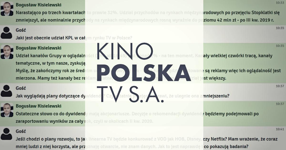 W piątek, 6 grudnia 2019 r. odbył się czat inwestorski z prezesem zarządu Kino Polska TV, Bogusławem Kisielewskim. Podczas spotkania rozmawialiśmy o wynikach finansowych za III kwartał 2019 roku. Inwestorzy zadawali również pytania o wezwanie na akcje Stopklatki, politykę dywidendową, udział spółki na rynku telewizyjnym oraz produkcje filmowe. W spotkaniu wzięło udział ponad 300 osób, a prezes zarządu odpowiedział na blisko 30 pytań. Zapraszamy do lektury całej relacji z czatu.