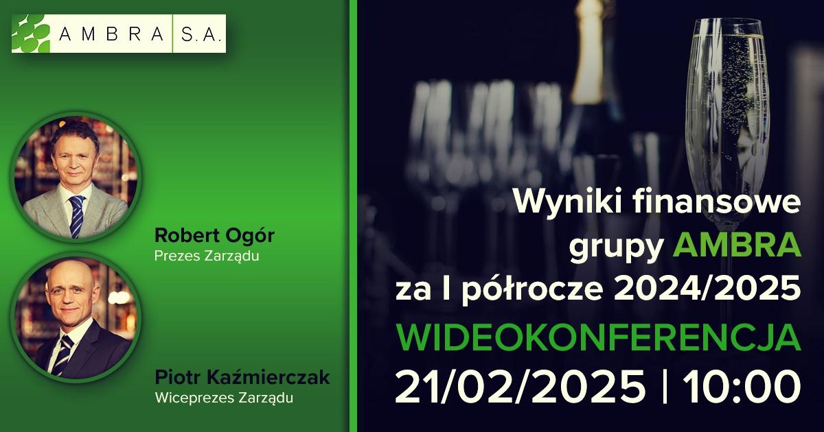 Zapraszamy do udziału w wideokonferencji grupy AMBRA, która odbędzie się przy okazji wyników za I półrocze 2024-25 roku. Spotkanie będzie transmitowane na żywo, a w drugiej części odbędzie się sesja pytań i odpowiedzi.