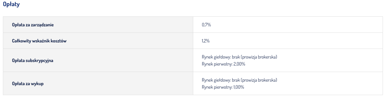Fundusz pobiera opłatę za zarządzanie na poziomie 0,7% rocznie, a całkowity wskaźnik kosztów wynosi 1,2%. Dodatkowo na rynku pierwotnym obowiązuje 2-procentowa opłata subskrypcyjna oraz 1-procentowa opłata za wykup. Inwestorzy kupujący jednostki na rynku giełdowym płacą wyłącznie standardową prowizję maklerską.