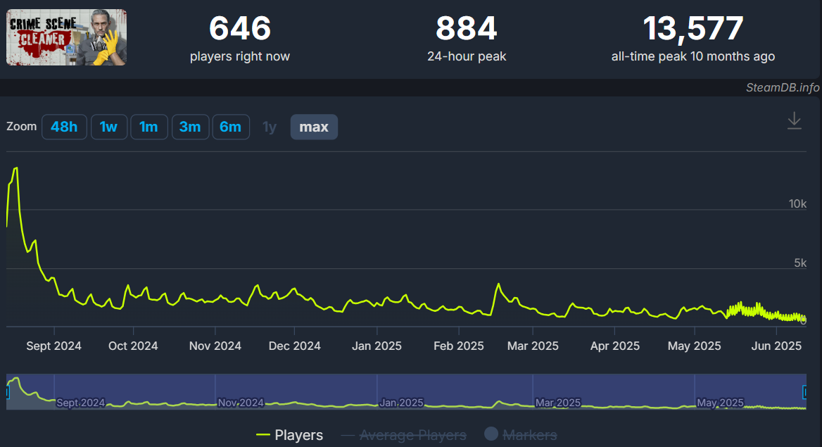 Liczba graczy Crime Scene Cleanera na Steam od premiery
