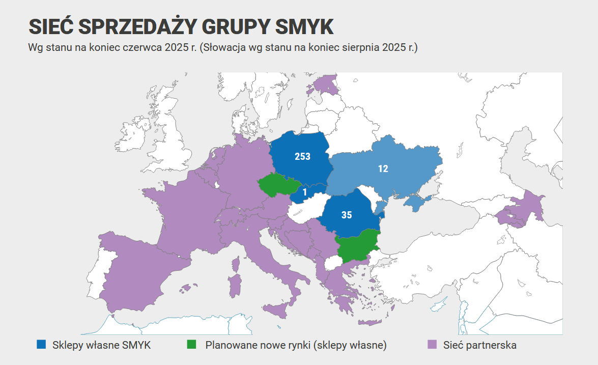 Sieć obejmuje 253 sklepy w Polsce, 35 w Rumunii i 12 na Ukrainie, z pierwszym własnym sklepem w Słowacji oraz planami wejścia do Czech i Bułgarii.