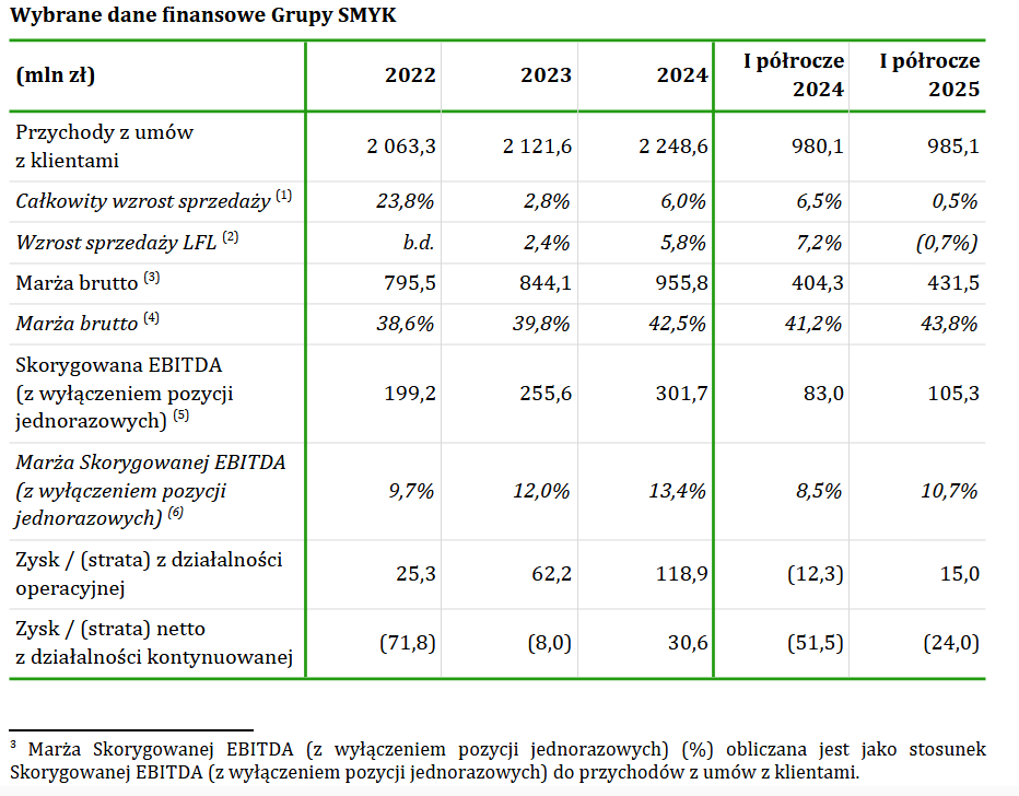 Smyk utrzymuje stabilny trend wzrostowy przychodów i poprawę rentowności, wspieraną skalą i efektywnością modelu omnichannel. W 2024 r. przychody z umów z klientami sięgnęły około 2,25 mld zł (+6% r/r), marża brutto wzrosła do 42,5%, skorygowana EBITDA wyniosła około 301,7 mln zł (+18% r/r), a zysk z działalności operacyjnej podniósł się do około 118,9 mln zł (+91% r/r).