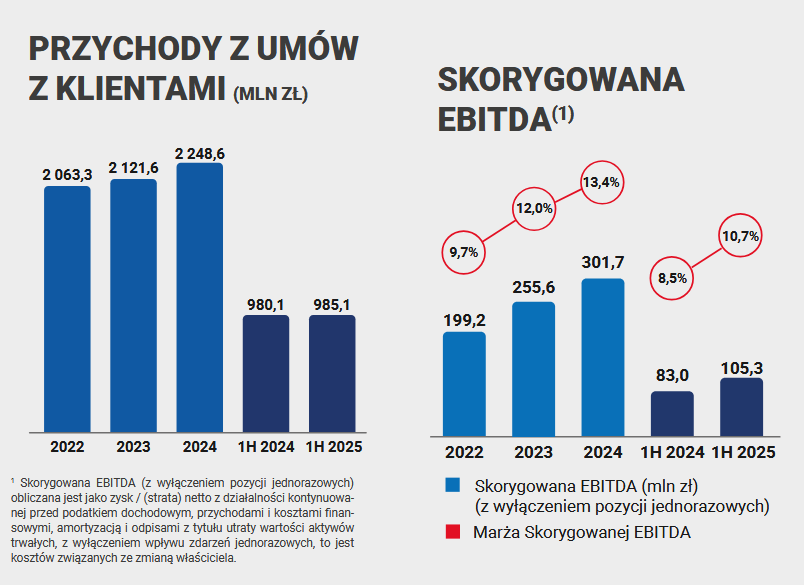W I półroczu 2025 r. grupa utrzymała wysoką marżowość mimo umiarkowanego wzrostu sprzedaży: przychody wyniosły około 985,1 mln zł (+0,5% r/r), marża brutto sięgnęła 43,8%, skorygowana EBITDA 105,3 mln zł (+26,9% r/r), a wynik operacyjny poprawił się do około 15 mln zł z ujemnych 12,3 mln zł rok wcześniej.