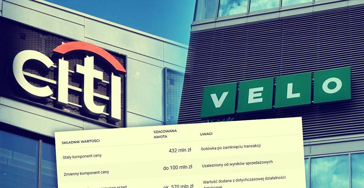 Wartość transakcji sprzedaży bankowości detalicznej Citi Handlowego do VeloBanku szacowana jest na maksymalną kwotę 1,1 mld zł, co odpowiada wskaźnikowi ceny do wartości księgowej (P/BV) na poziomie ok. 0,85x.