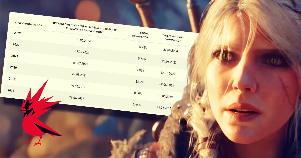 Zgodnie z rekomendacją opublikowaną 7 maja 2025 r., CD Projekt planuje wypłatę dywidendy w wysokości 1,00 zł na akcję. Będzie to piąta z rzędu wypłata i siódma w całej historii studia. Tegoroczna dywidenda stanowi 21% zysku netto i jest zbliżona do minimalnego poziomu wskazanego w przyjętej polityce dywidendowej - 25% zysku netto. Choć nowe zasady wypłaty dywidendy miały dotyczyć zysków wypracowanych dopiero w 2025 roku, a więc w przyszłym roku, jeśli utrzyma się zysk na tym samym poziomie, możemy spodziewać się wyższej dywidendy.